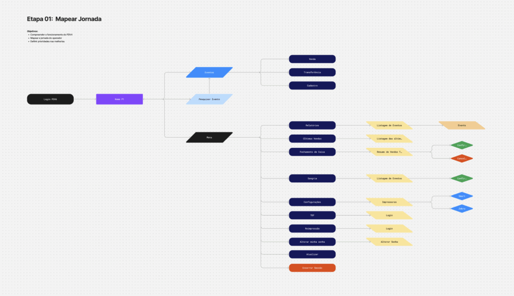 Nesta etapa, desenhei fluxos completos considerando venda, estorno, conferência e relatórios.